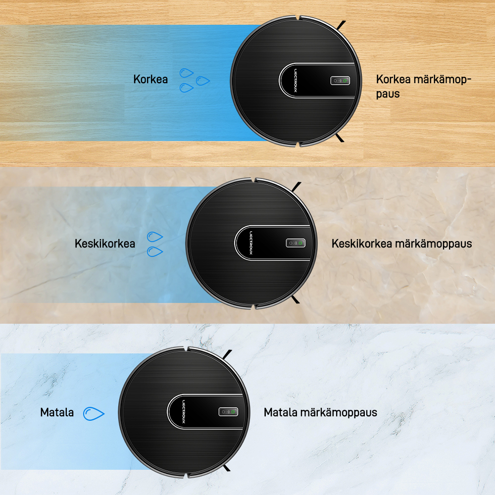 Jokainen koti on erilainen, samoin kuin puhdistustarpeesi. Tämä robotti-imuri tarjoaa useita säätötiloja, joiden avulla voit mukauttaa sen suorituskykyä. Valitse eri imutehoista, harjan nopeuksista tai puhdistusmalleista, jotka vastaavat täydellisesti lattiatyyppiäsi ja likaisuusastetta varmistaen optimoidun puhdistuksen joka kerta.